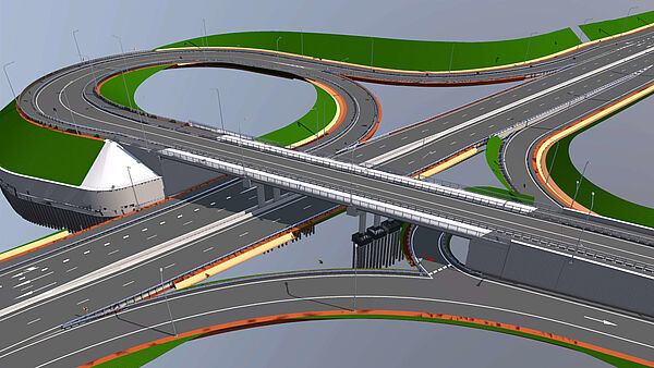 ALLPLAN Civil unifies three advanced parametric modeling approaches that support conventional modeling and provide effective approaches for the expanded scope of civil structures. These include axis-based modeling technology (extrusion of cross-sections along a road axis), polygonised modeling and free parametric modeling.