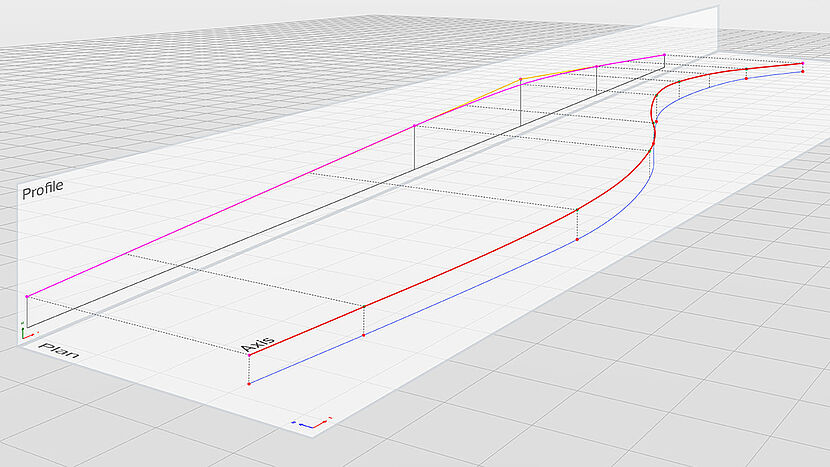 Every bridge construction project starts with one or more axes – with ALLPLAN Bridge, you can adopt the data from an existing design (using LandXML data format) or define it manually. In both cases, the alignment is parametrically saved.