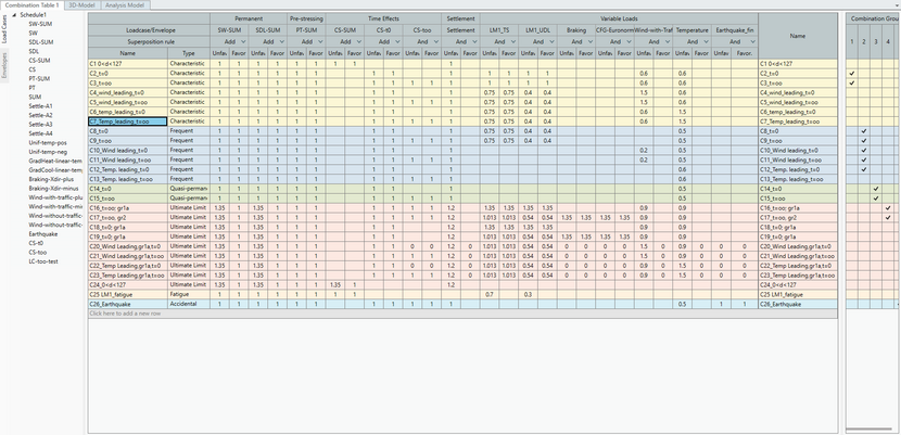 The definition and visualization of combination in table form gives the user an overview not only of the defined load factors but also of different types of combinations. The combination type becomes an important attribute when the code-based design is performed. This allows for automatically using the corresponding combinations for specific design procedures.