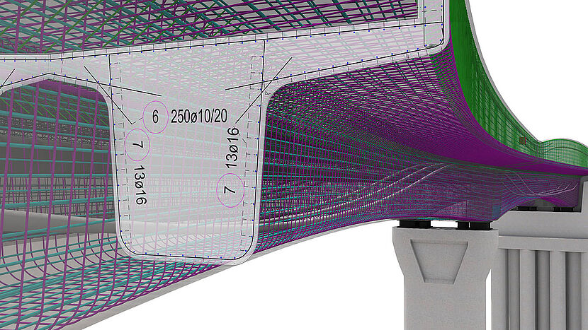 With ALLPLAN, even challenging bridges with double curvature and varying cross-sections are reinforced conveniently and rapidly. The reinforcement is defined in different cross-sections and the transitions between the cross-sections are described with paths. Various rules can be defined, such as how the reinforcement joints are to be carried out. Using this information, the reinforcement is automatically generated.
