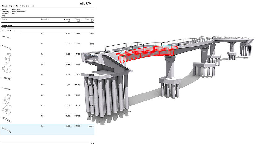 The digital bridge model contains a multitude of information. Comprehensive reports with dimensions, areas, volumes, weights and quantities are available at the touch of a button. This also applies to rebar bending schedules.