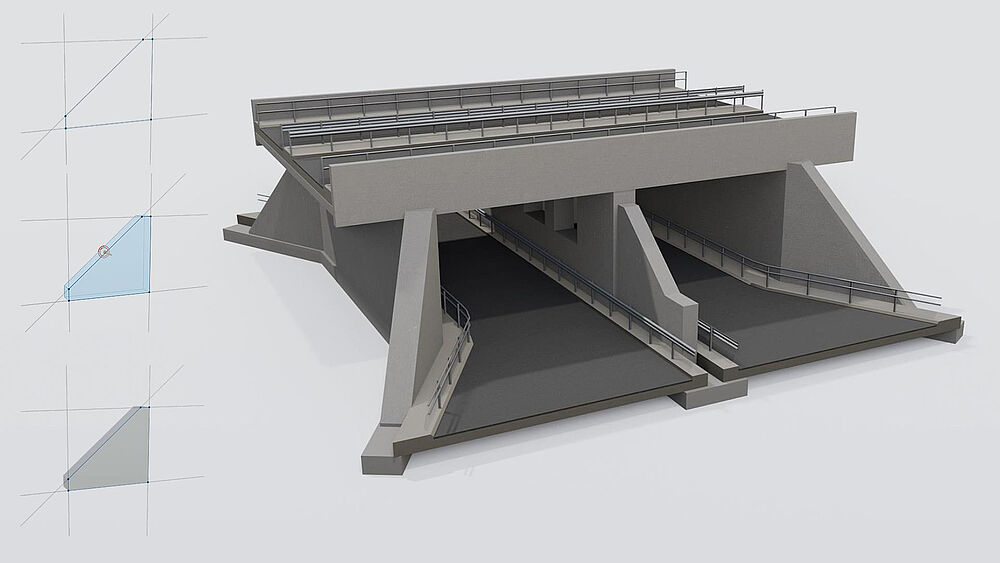 The free parametric modeling approach follows the main product philosophy, namely that all the modeling elements are connected parametrically. This is true not only for the new prism elements but also for all the Boolean operations that are possible. To allow for smooth management of changes, also for larger and more complex structures, in Allplan Bridge the complete geometry calculation now uses a new and more advanced calculation procedure – “dependency tree-based solver”. This algorithm generates a tree of dependencies between individual objects such that only the part of the model which is affected by the implemented change is recalculated.