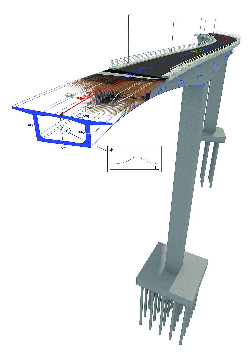 In Allplan Bridge, geodetic data from road design (road alignment), as basis for construing the bridge axis, is generally imported via the open BIM platform Allplan Bimplus. The user must only accept the data and can immediately begin with the bridge design. In Allplan Engineering, the complete range of functionality can be used for further detailing, including prestressing, reinforcement, quantity take-off as well as drawing generation. The complete bridge model can also be passed to a structural analysis solution, directly from Allplan Bridge.