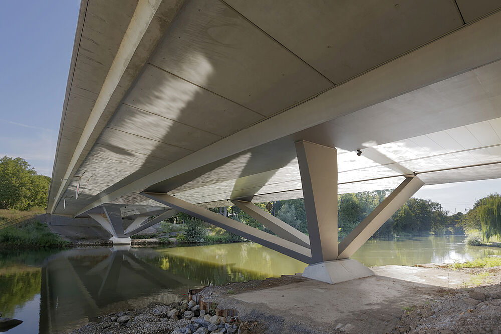 The “Bleichinselbrücke” ideally meets all the demands of sustainable construction design. It sensitively adjusts to the urban environment but nevertheless displays high recognition value thanks to its modern design language. Despite difficult construction conditions, the bridge could be built very cost-effectively. Thanks to a sturdy design with an integral construction, low maintenance costs and a long operating life can be expected. At 88 meters long and 24 meters wide, the heavily travelled four-lane bridge crosses the old Neckar near Heilbronn and connects the center of the city with a newly built residential area that has been created as part of the Federal German Garden Show 2019. These newly created common areas and promenades along the riverbank had to be considered when designing the bridge. This special location within a very shallow river basin and in close proximity to neighboring bridges, resulted in a deck bridge design being chosen. The “Bleichinselbrücke” fits harmoniously into the environment. At the same time, it offers high amenity value – both above as well as below the bridge.