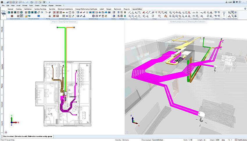 [...read more]The range of tasks that can be carried out with ALLPLAN and AX3000 solutions in the field of residential ventilation extends from the creation of the ventilation concept using the AX3000 Room Book to the determination of air volumes and automated, detailed planning in 3D with all components and parts lists.