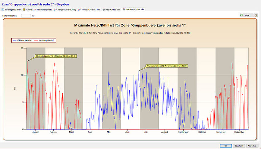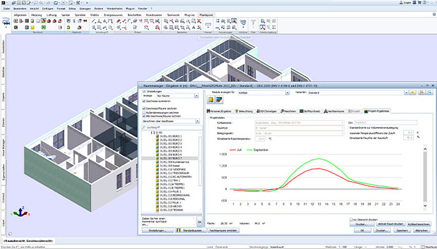 The AX3000 Temperature Simulation module is the ideal tool for the dynamic thermal simulation of a building. The zone and system definitions can be automatically taken from the energy certificate or freely defined. Specify internal and external influencing factors and automatically calculate the course of the hourly heating and cooling load.