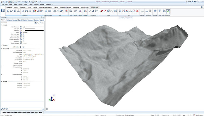 [...read more]Terrain data can be read in the form of large point clouds (for example from Scalypso) and displayed graphically. This makes it possible to use high-resolution terrain models as the basis for mass determinations within infrastructure projects.
