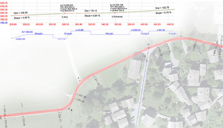 With the help of reports, parameters of the road model can be output in tabular form. For example, staking points can be created, point distances calculated or bulk and fill volumes determined. The calculation accuracy is freely selectable, and the results can be easily transferred to corresponding programmes for data processing.