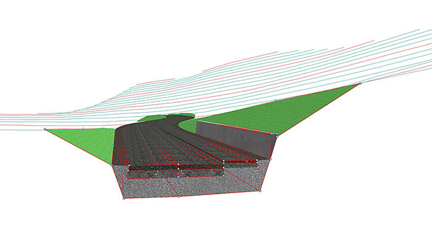 Terrain data can be read in the form of large point clouds (for example from Scalypso) and displayed graphically. This makes it possible to use high-resolution terrain models as the basis for mass determinations within infrastructure projects.