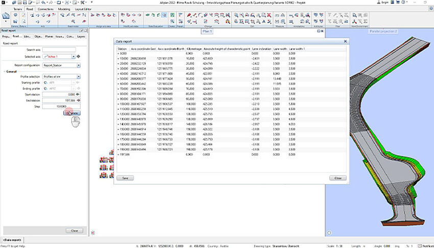 [...read more]With the help of reports, parameters of the road model can be output in tabular form. For example, staking points can be created, point distances calculated or bulk and fill volumes determined. The calculation accuracy is freely selectable, and the results can be easily transferred to corresponding programmes for data processing.