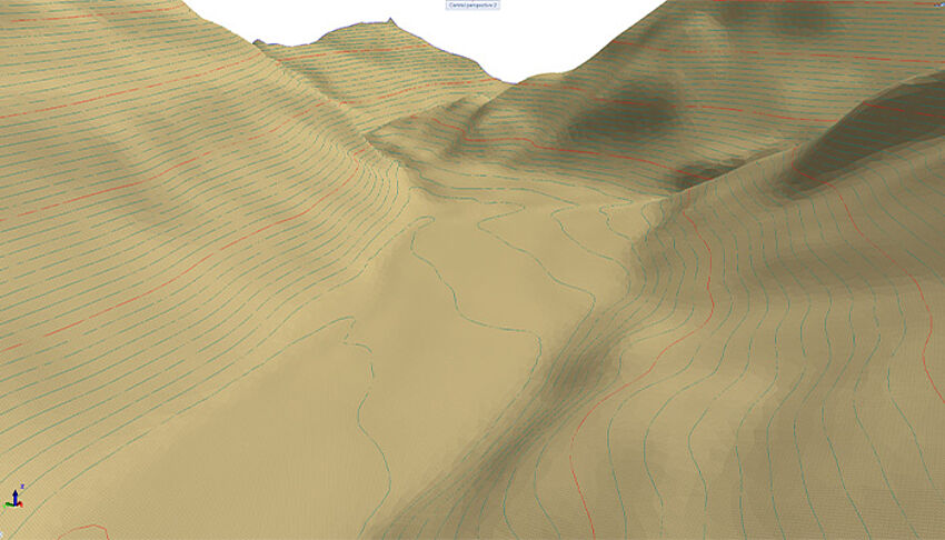 Terrain data can be imported in the form of large point clouds (e.g. from Scalypso) and displayed graphically. This makes it possible to use high-resolution terrain models as the basis for mass determinations within infrastructure projects.