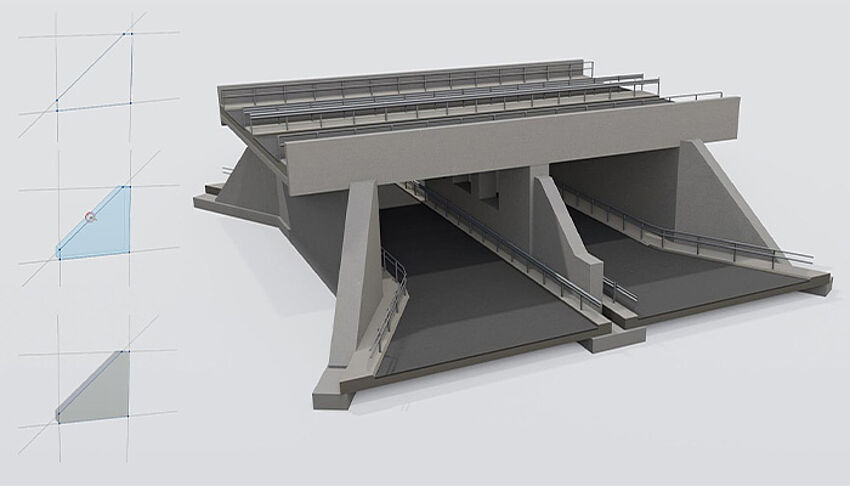 The modeling technique is tailored for bridges, especially for bridges with geometry directly governed by the axis. Once the axis is imported or defined, the user defines typical cross-section(s) which are extruded along the axis. The digital model generated in ALLPLAN CIVIL is completely parametric. Model changes can be made at any time and the dependent objects are automatically adjusted. ALLPLAN CIVIL is suitable for all phases of work – from the concept to the detailed design.