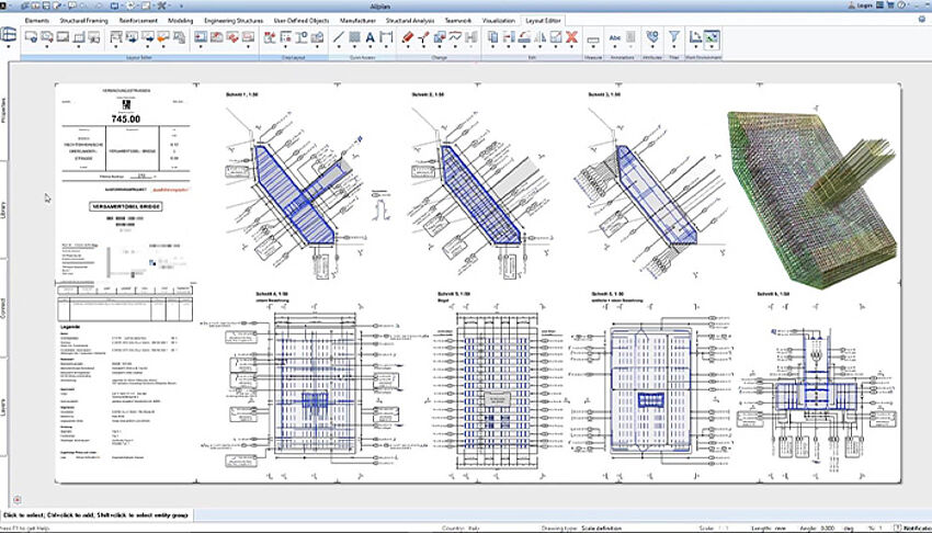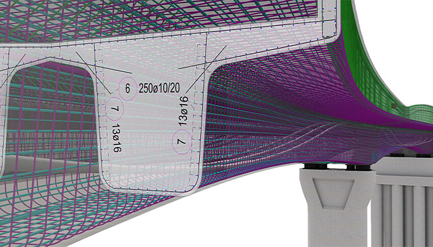 [...read more]In reinforcement drawings, the position, number, spacing, dimensions and bending of the reinforcement bars for the relevant components are specified and evaluated in the form of steel lists. In this way, detailed plans are created rapidly. The creation of reinforcement drawings for straight or curved structures is not a problem. With ALLPLAN, even challenging bridges with double curvature and varying cross-sections are reinforced conveniently and correctly.