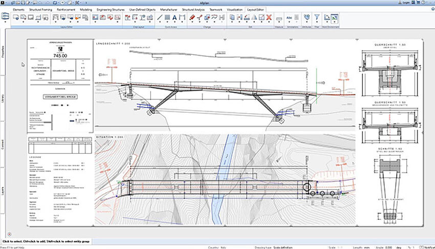 [...read more]The import of data from road planning can be used as the basis for the axis definition of the bridge, and is carried out in ALLPLAN CIVIL via the open BIM platform BIMPLUS. The bridge engineer only has to import the data and can do everything from model creation, prestressing, structural analysis and detailing to plan creation with one solution.