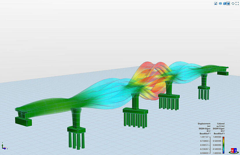 Further also the mass matrix is required, representing the vibrating masses of the structure, as governing parameter of the Eigen value calculation. In the program, the self-weights and superimposed dead loads as defined for the static load-case calculation and any further user defined masses are considered for calculating a consistent mass matrix.