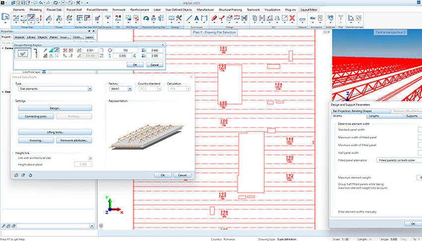 [...read more]ALLPLAN Precast Slabs automatically places the composite recesses and offers maximum flexibility for jointed systems. For filigree slabs, the software performs a shear force and bond check and installs any necessary lattice girders, if required.
