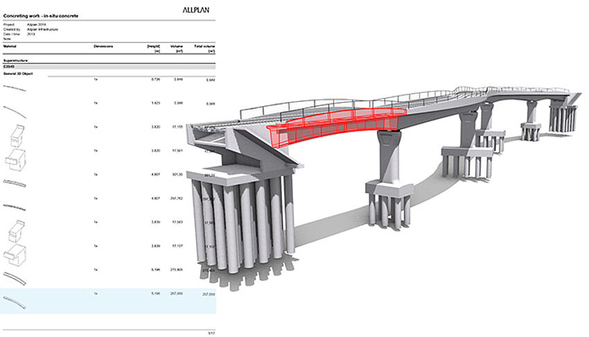 The digital bridge model contains a multitude of information. Comprehensive reports with dimensions, areas, volumes, weights and quantities are available at the touch of a button. This also applies to rebar bending schedules.
